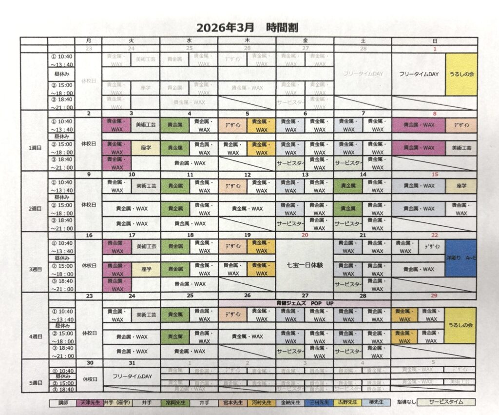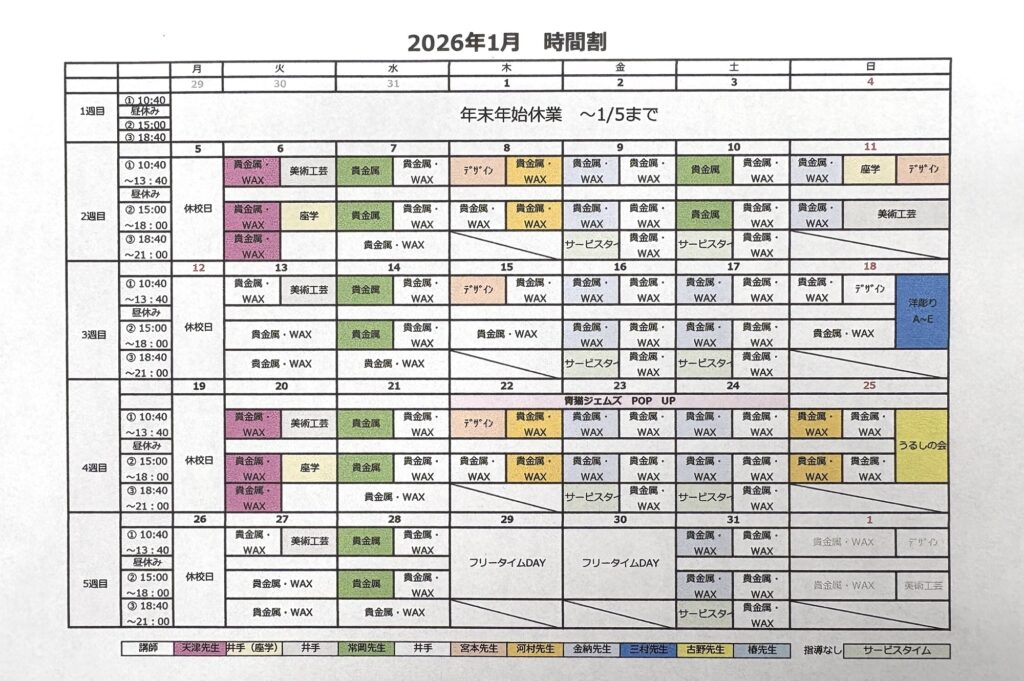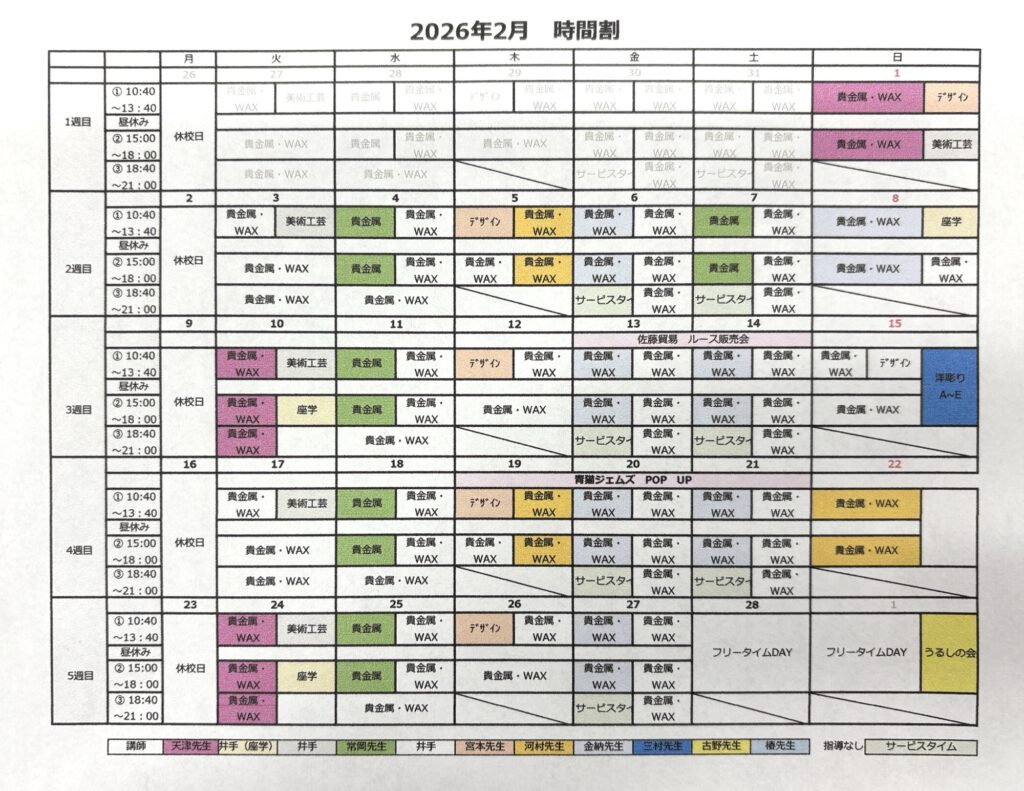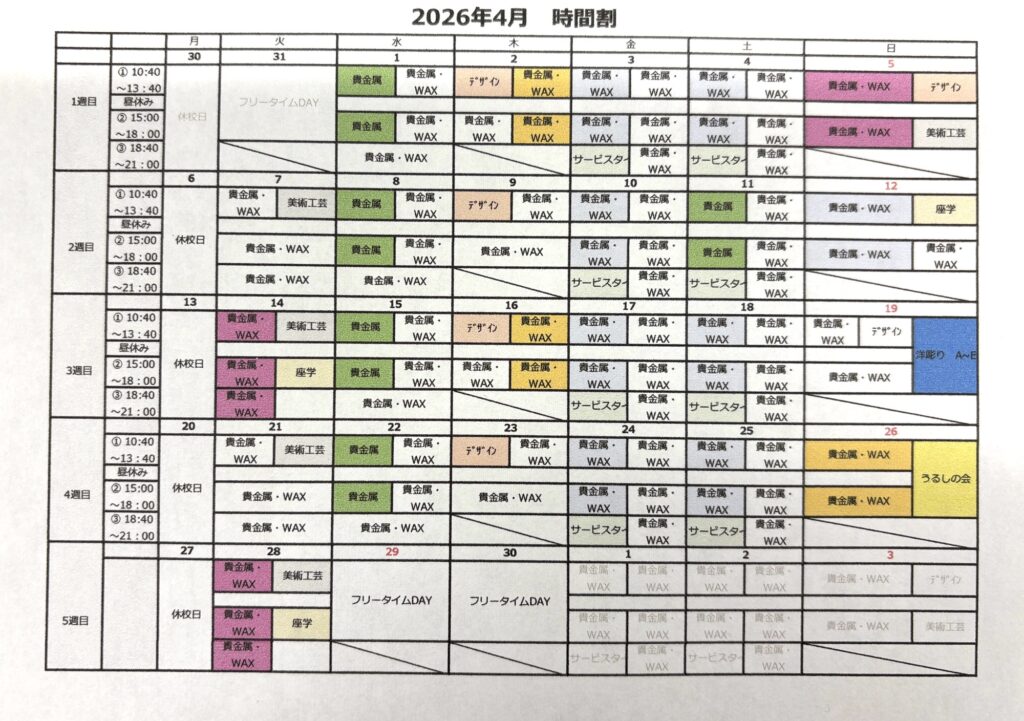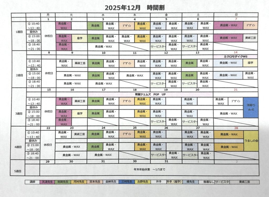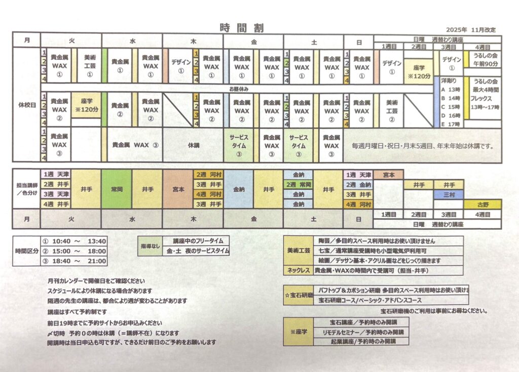 月ごとの時間割は以下をご確認下さい。2025.11.18更新